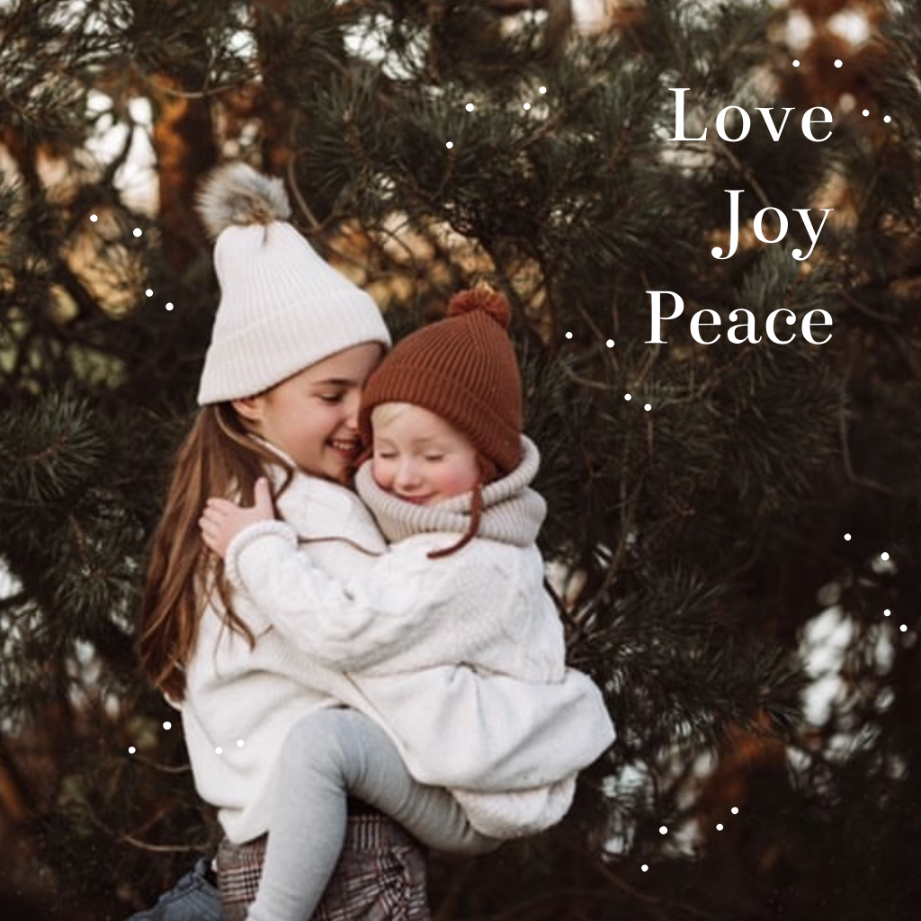 Dit lieve kerstkaartje met mooie foto van een broertje en zusje van Hanne Wursten kun je natuurlijk zelf helemaal aanpassen naar wens en smaak. Wat nu in goudfolie is kun je ook omzetten in een andere foliekleur. Love Joy Peace.