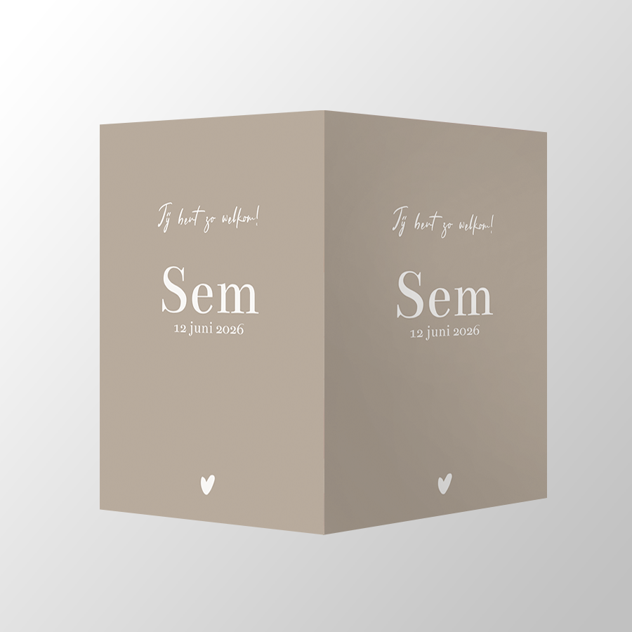 Deze geboorte aankondiging is dubbel en kun je op een raam plakken. Deze heeft een minimalistische uitstraling met beige en witte tinten en een hartje. Dit kun je zelf aanpassen naar wens.