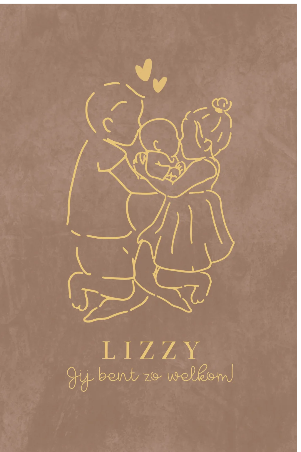 De gouden lijntekening en velourse look hoort bij het geboortekaartje Lizzy.