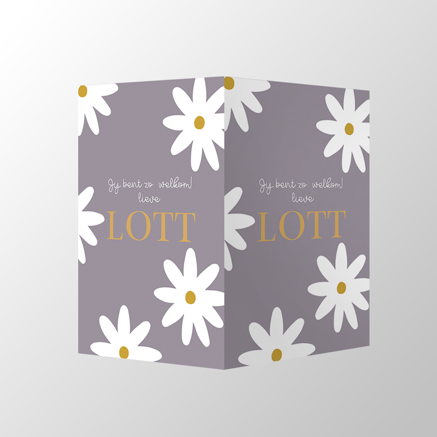 Deze geboorte aankondiging is dubbel en kun je op een raam plakken. Dit bord heeft schattige madeliefjes en goudkleurige tekst die perfect passen bij het kaartje Lott. Het bord is volledig aan te passen naar wens in de editor.