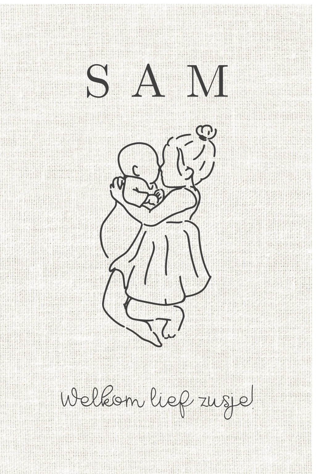 Geboortebord raam unisex met linnen achtergrond en lijntekening zusje