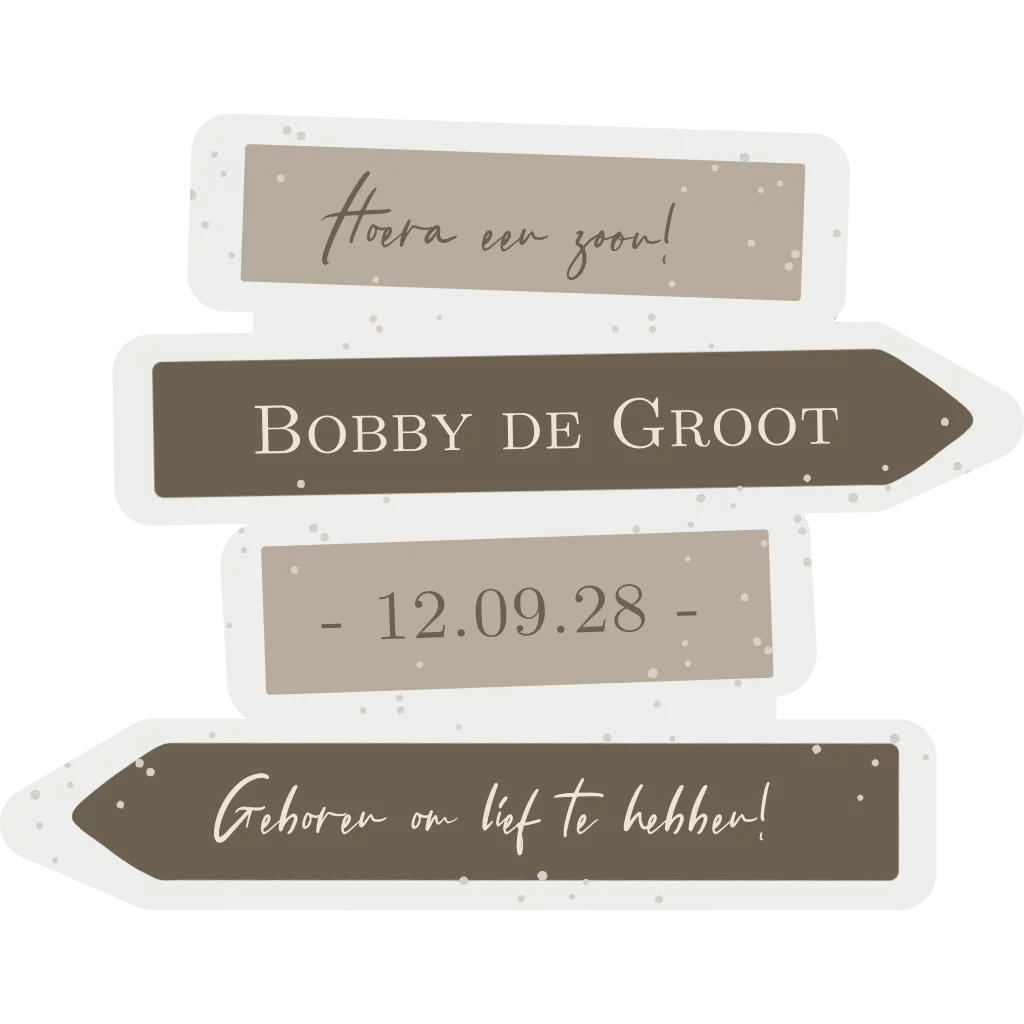 Een geboorte aankondiging voor jullie zoon of dochter in de vorm van een wegwijzer tuinbord.