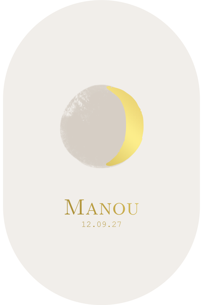Dit geboorte-rouwkaartje kan voor zowel een jongen als een meisje. De ovalen stansvorm geeft het kaartje en unieke uitstraling in combinatie met het goudfolie en natuurlijk de maanstand vorm.