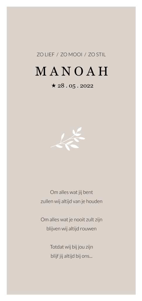 Dit eenvoudige rouwkaartje met takje illustratie is tegelijk erg chique door de zwartfolie opdruk. Je kan de zwartfolie ook aanpassen naar goudfolie, koperfolie of roséfolie of zet het om naar een kleur. Ontwerp het kaartje zelf tot het helemaal naar wens is. Kom je er niet uit, we helpen je graag!