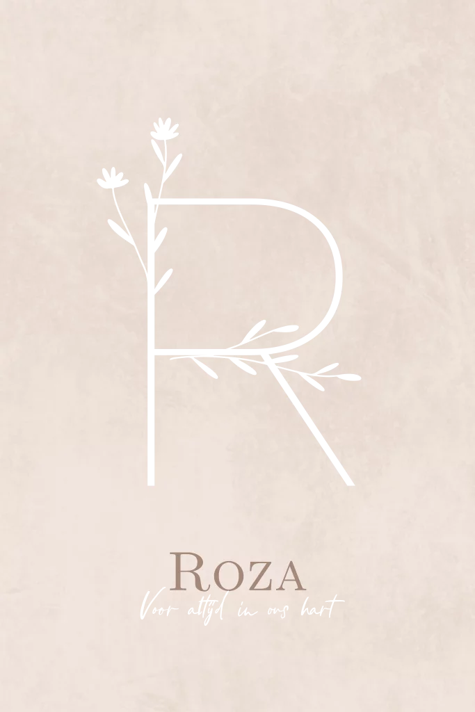 Een lief geboorte-rouwkaartje voor een meisje met de eerste letter van de naam in goudfolie druk. De takjes en bloemen zijn ook in folie gedrukt.