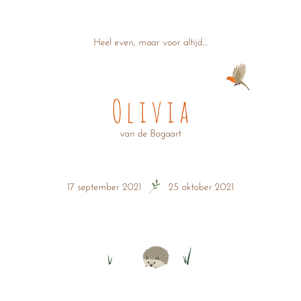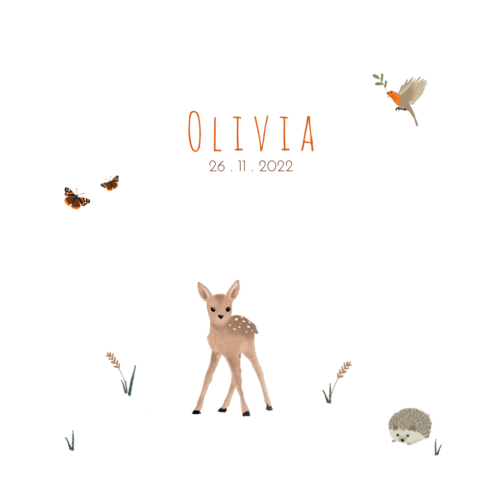 Lief kaartje met mooi geïllustreerd hertje, egel, vlinders en vogel. De ronde hoeken geven een extra zachte uitstraling aan het kaartje, maar deze kan je eventueel ook uit zetten. Dit kaartje komt het mooiste tot zijn recht op Eco papier of Oud Hollands. 13x13 cm is het meest gangbare formaat, maar 11x11 cm is bij dit kaartje ook erg mooi en verfijnd. Pas zondig aan en kies een bijpassende kleur envelop in de volgende stap.