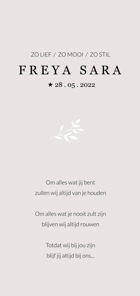Dit eenvoudige rouwkaartje met takje illustratie is tegelijk erg chique door de zwartfolie opdruk. Je kan de zwartfolie ook aanpassen naar goudfolie, koperfolie of roséfolie of omzetten naar een kleur. Ontwerp het kaartje zelf tot het helemaal naar wens is. Kom je er niet uit, we helpen je graag!