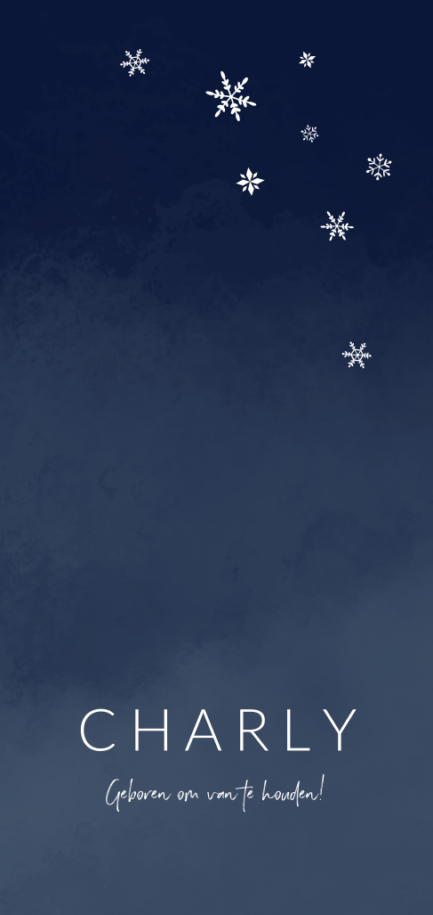 Een winters geboortekaartje met sneeuwvlokken in folie kleur. Met de donkere blauwe kleur van de nacht. De kleuren kun je allemaal aanpassen naar wens.
