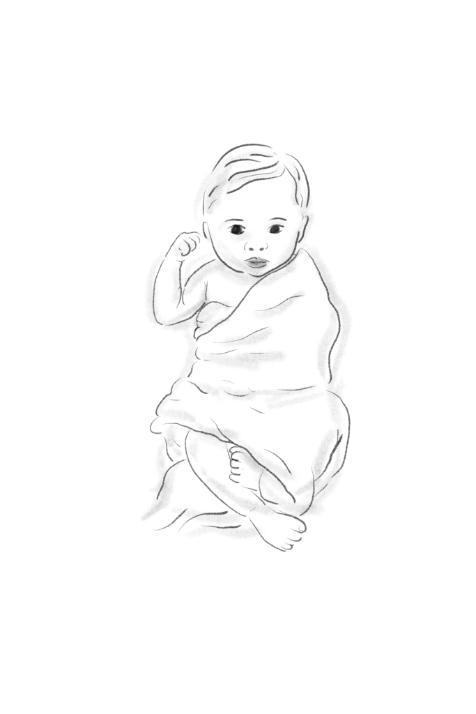 Een lief geboortekaartje in de ouderwetse stijl van vroeger met een houtskool tekening van een baby. Eenvoudig met de naam in folie.