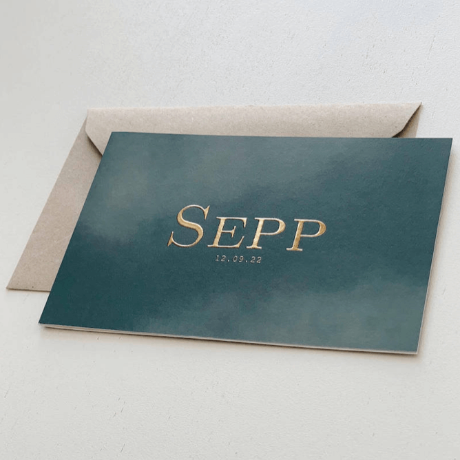 Donkergroen geboortekaartje voor een jongen met goudfolie
