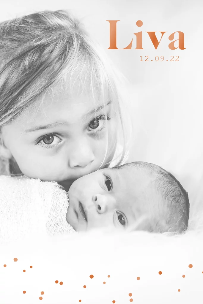 Geboortekaartje voor een meisje met foto en stipjes in koperfolie