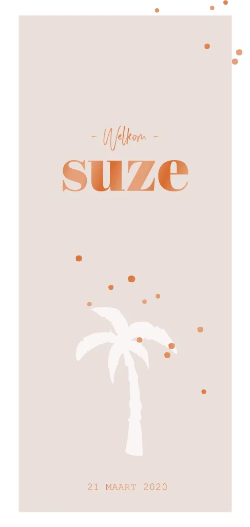 Dit zomerse geboortekaartje voor een meisje met een palmboom witte rand en oud roze achtergrond kun je aanpassen naar zoals je wilt. De stipjes en tekst in koperfolie UV spotlak kun je aanpassen.
