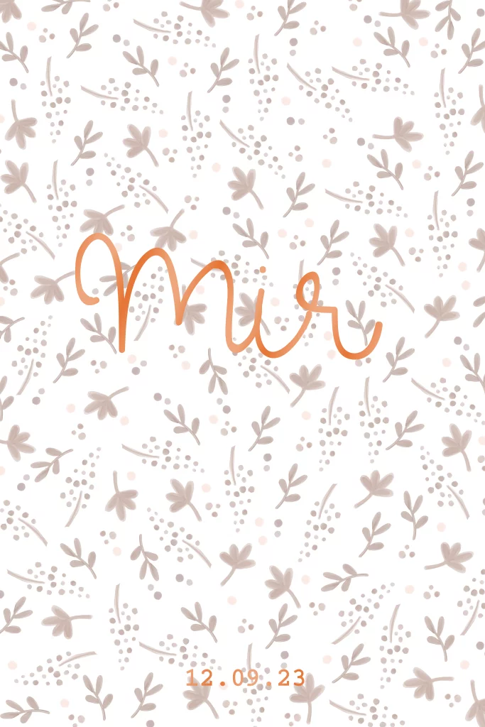 Een lief geboortekaartje voor een meisje met mooi retro bloemenprintje in de kleuren oud roze bruin. Het koperfolie kun je omzetten in goudfolie, zilverfolie of rosefolie. Mir