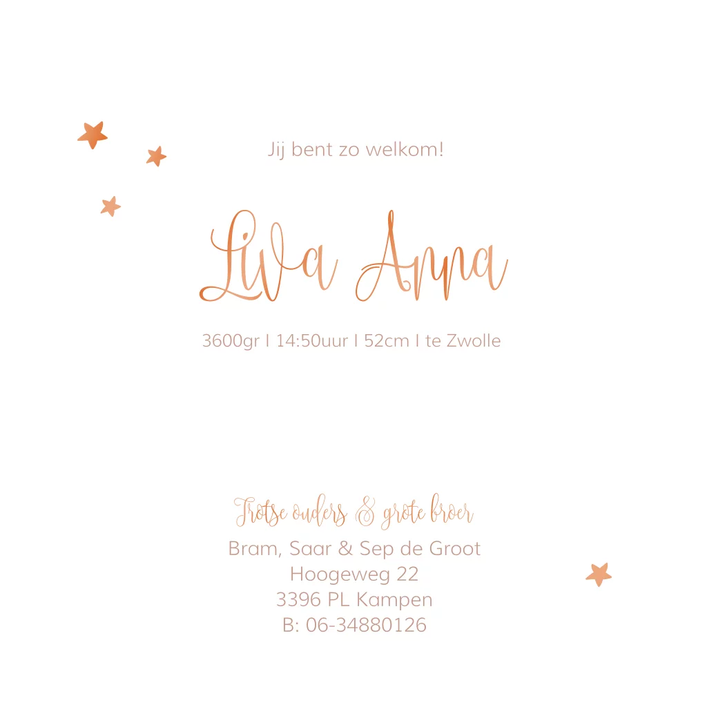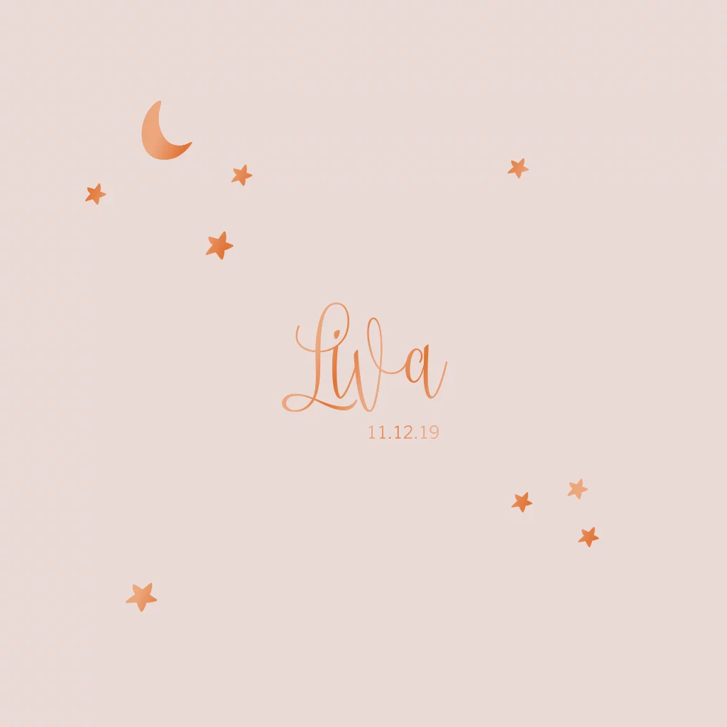 Dit geboortekaartje voor een meisje met sterren en maan in koperfolie en licht roze achtergrond kun je zelf aanpassen naar wens. Je kunt ook voor goudfolie of zilverfolie kiezen.