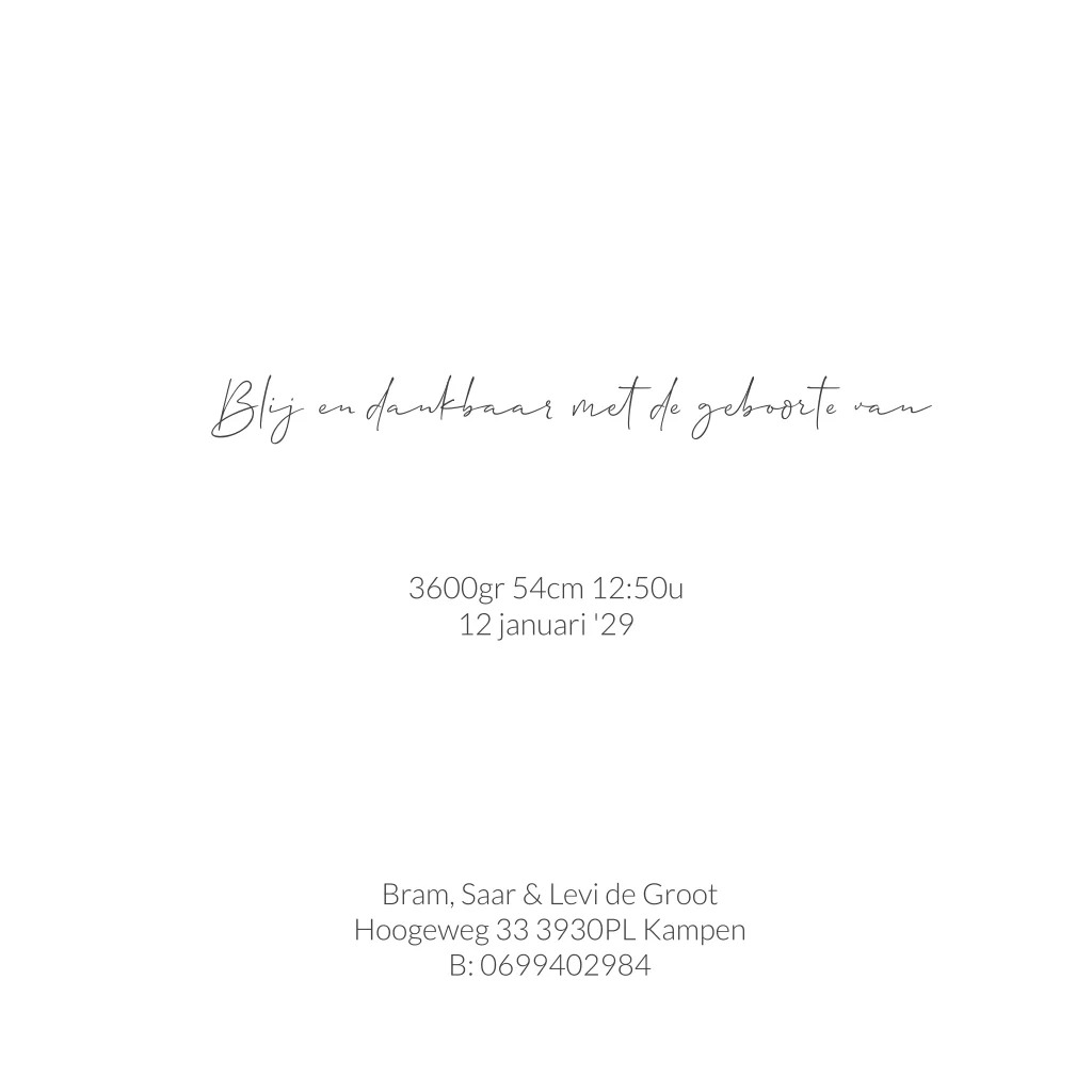 Een dubbel vierkant klassiek geboortekaartje voor een meisje of jongen met een gouden strikje en goudfolie letters.