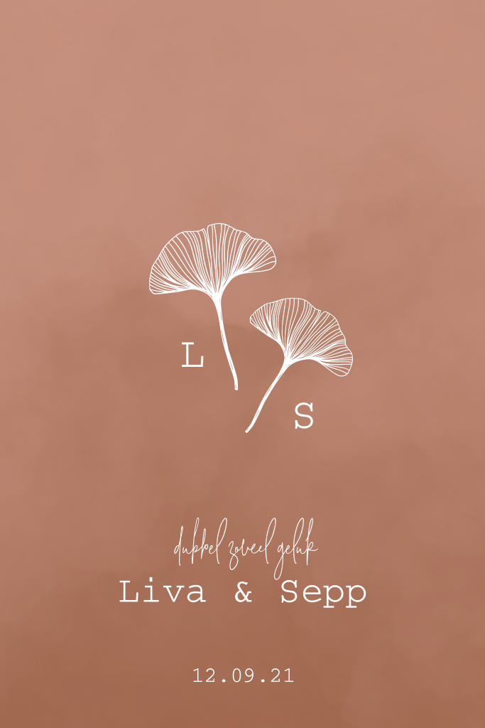 Dit geboortekaartje voor een tweeling is unisex en kan voor beide geslachten door de roest bruin rode achtergrond kleur en het goudfolie. De initialen van de kinderen bij het Ginkgo blad maken het kaartje uniek.