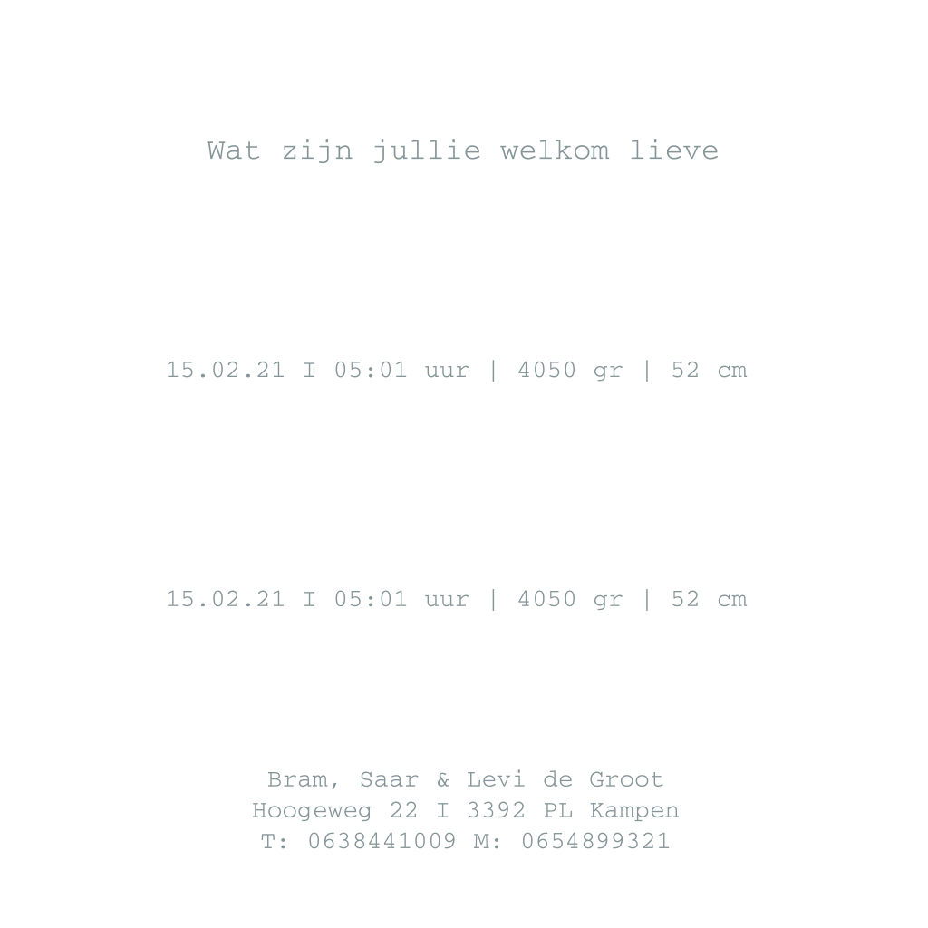 Dit mooie minimalistische geboortekaartje voor een jongens tweeling is door de eenvoud prachtig. Je kunt alles aanpassen naar wens. Zo ook het goudfolie op de binnen- en buitenkant van de kaart.