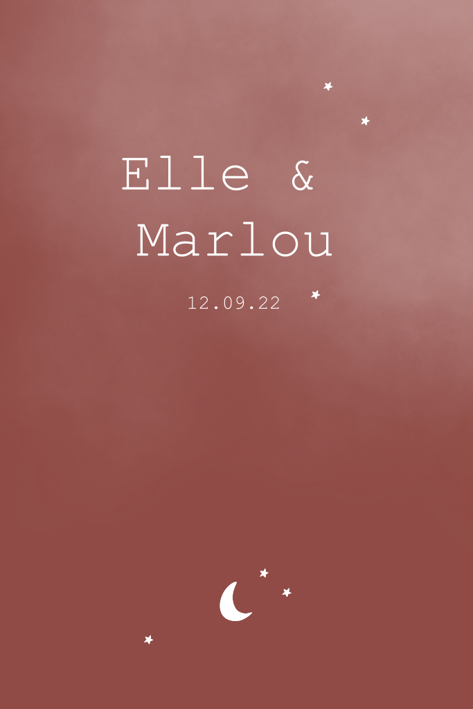 Dit geboortekaartje is gemaakt voor jullie prachtige tweeling. Het kaartje heeft een stoere uitstraling door de rode roest achtige kleur. De maan en sterren in goudfolie geven het kaartje ook een lieve chique uitstraling. Je kunt dit aanpassen naar zilverfolie, roséfolie of koperfolie. Ook de achtergrond kleur kun je aanpassen.