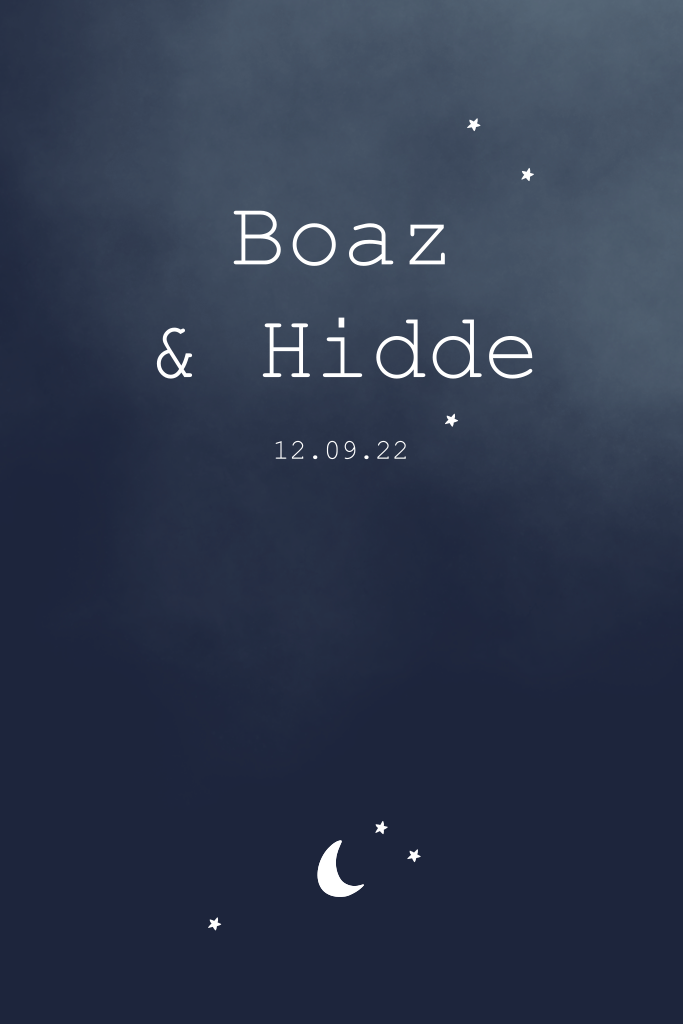 Dit geboortekaartje voor een jongens tweeling heeft een stoere uitstraling door de donkerblauwe achtergrond en de sterren en maan in goudfolie. Dit kun je ook omzetten naar zilverfolie, roséfolie of koperfolie. Ook de blauwe achtergrond kun je aanpassen naar een kleur die bij jullie past.