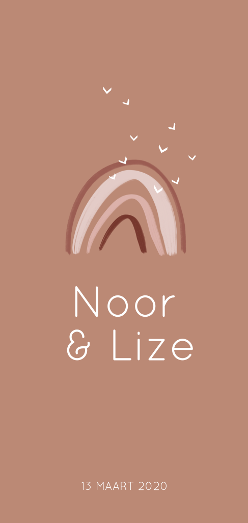 Dit langwerpige geboortekaartje met regenboog is voor een meisjes tweeling. Het ontwerp is gemaakt voor de baby van Louise Boonstoppel. Het goudfolie kun je omzetten naar een andere foliedruk. En ook de kleuren van de kaart kun je aanpassen voor jullie dochters.