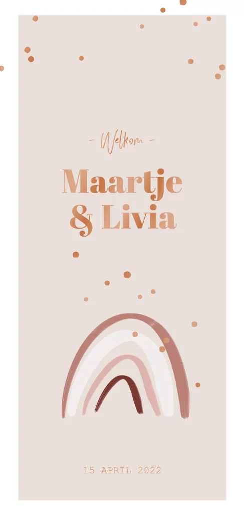 Dit langwerpige geboortekaartje voor een meisjes tweeling met oud roze achtergrond en rood roze regenboog kun je aanpassen naar wens. Ook de stipjes en tekst die nu in koper kleurige UV spotlak staat kun je aanpassen. Je kunt kiezen uit roséfolie, goudfolie of zilverfolie. Zo maak je een unieke geboortekaart voor jullie prachtige tweeling.
