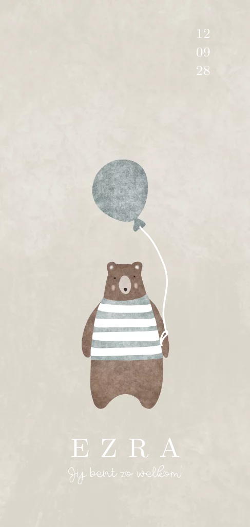 Lief geboortekaartje voor een zoontje met lieve illustratie van een bruine beer met blauw wit gestreepte trui aan.