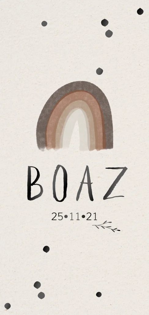 Dit lieve geboortekaartje voor een jongen met bruine regenboog stippen en zwarte lakfolie is ontworpen door @ell.mini (te vinden op Instagram) voor hun zoontje Boaz