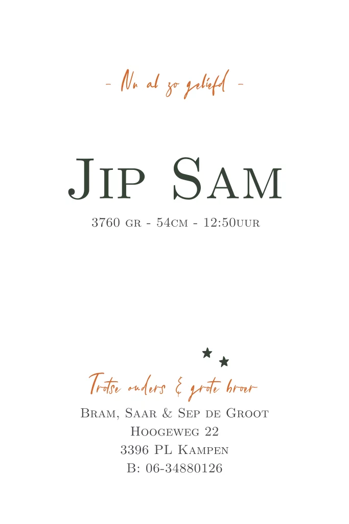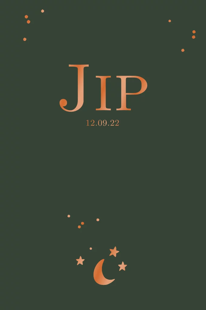 Dit geboortekaartje voor een jongen met maan en sterren in koper kleur UV spotlak folie met een donker groene achtergrond kun je zelf aanpassen naar wens. Je kunt het aanpassen naar een andere UV spotlak of foliedruk kleur.