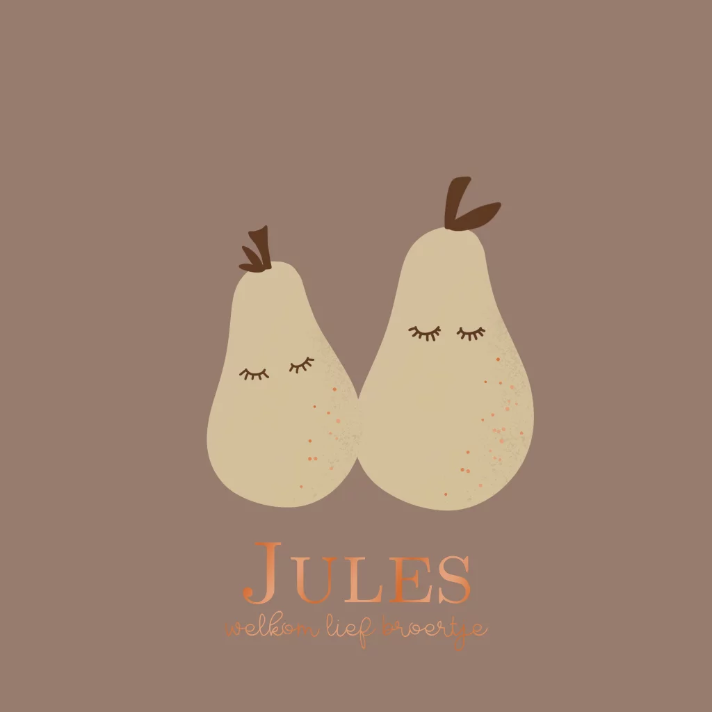 Geboortekaartje jongen meisje broertje zusje met peertjes koperfolie