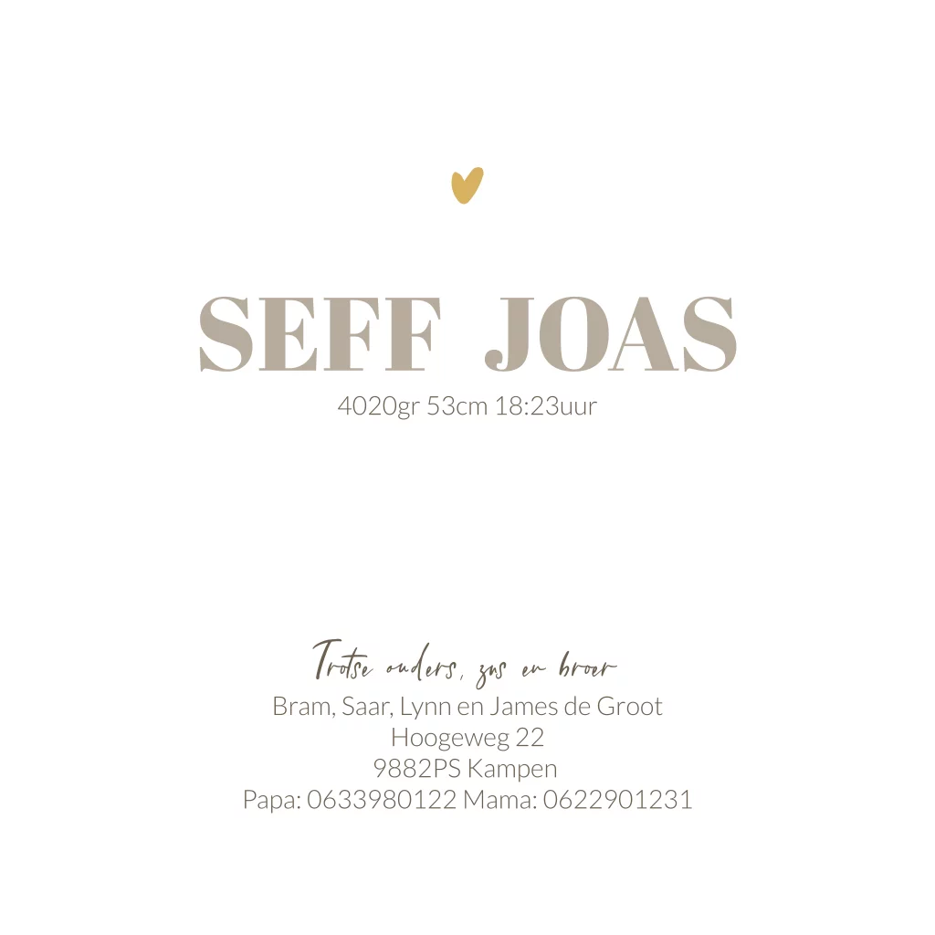 Dit lieve maar ook stoere dubbele geboortekaartje voor een jongen met een tekst en hartje in goudfolie kun je aanpassen naar wens.
