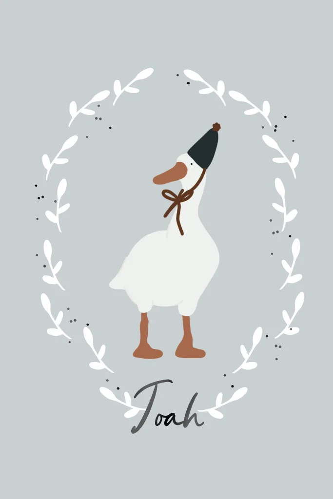 Een lief geboortekaartje met illustratie van een gans of eend met feestmuts. De krans en de blauwe achtergrond kleur kun je aanpassen net zoals de zwarte lakfolie.