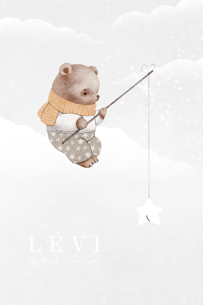 geboortekaartje jongen met geschilderd beertje wolken goudfolie