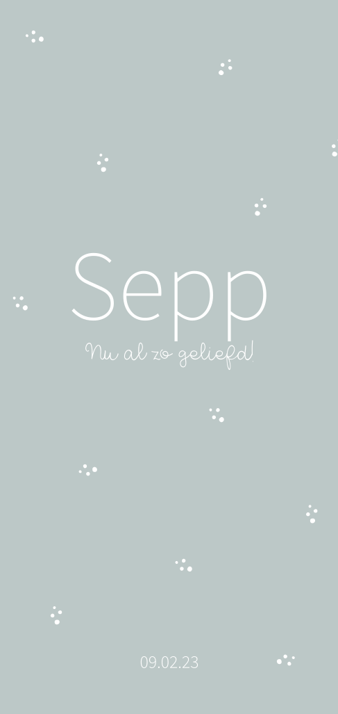 Lief geboortekaartje voor een jongen met lichtblauwe groen achtergrond en stipjes in foliedruk. Dit kaartje voor een zoon kun je zelf aanpassen naar wens en smaak.