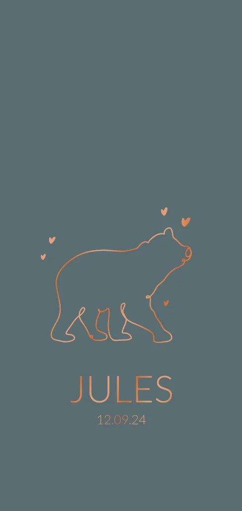 Een geboortekaartje met een lijntekening van een beer in koperfolie kleurige UV spotlak.