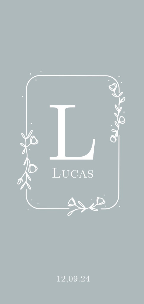 Lief klassiek geboortekaartje voor een jongen met een bloemen krans om de eerste letter van de naam in zwarte lakfolie. De kleur van het folie maar ook de blauwe achtergrond kun je zelf aanpassen naar wens.