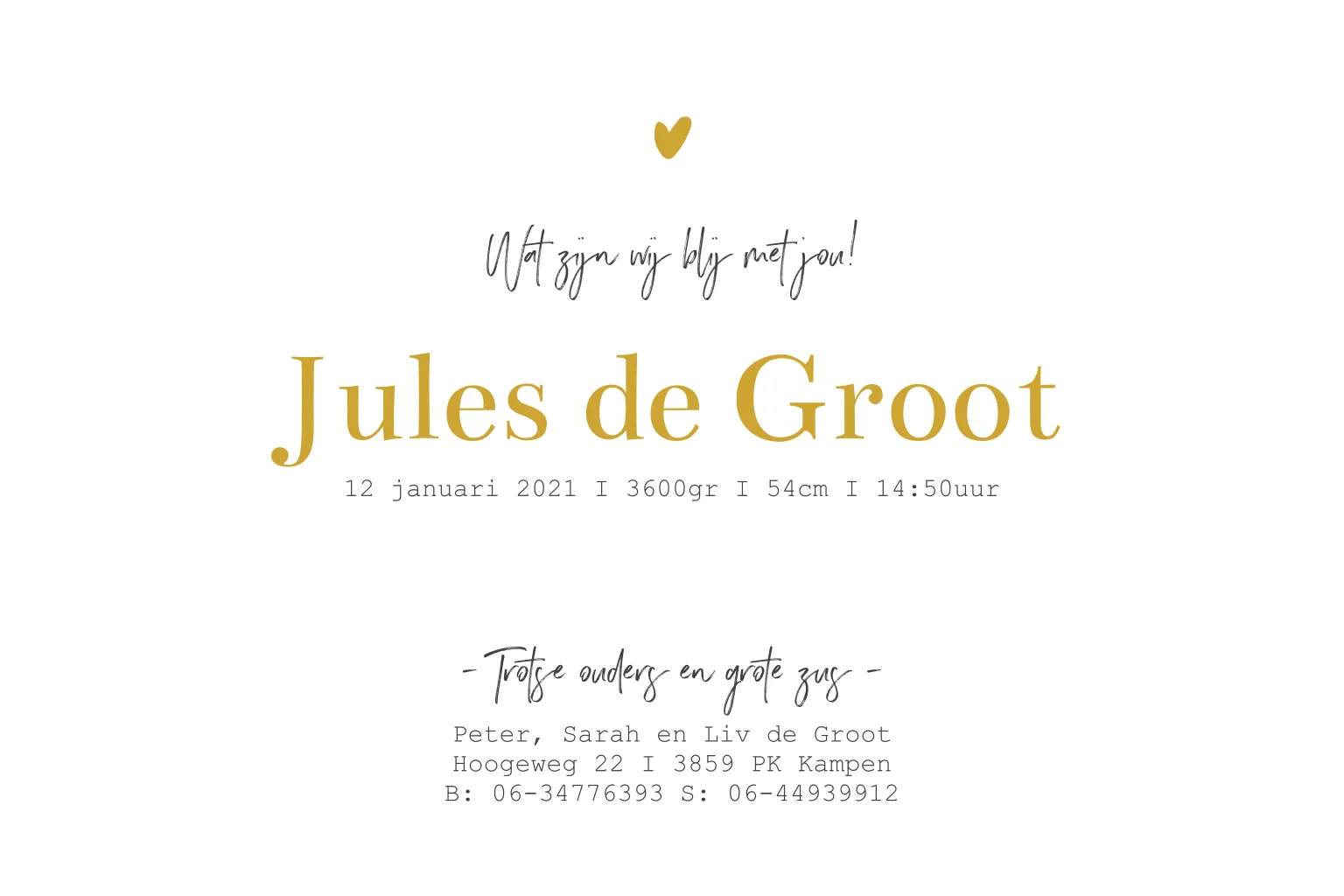 Geboortekaartje jongen met newborn foto en tekst goudfolie