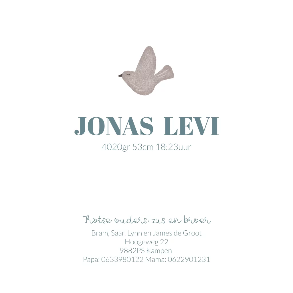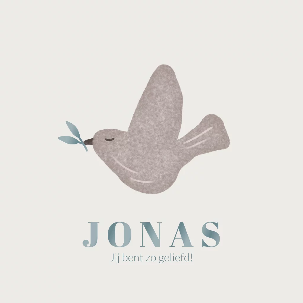 Dit lieve geboortekaartje voor een jongen met vredes duif met olijftakje in de bek kun je elf aanpassen naar wens.