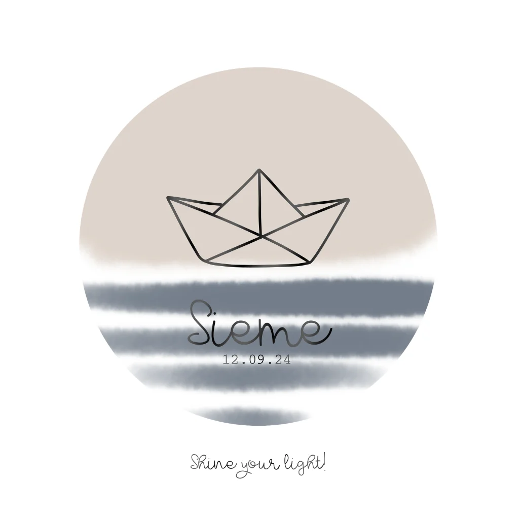 Een geboortekaartje voor een jongen met een 'papieren' bootje in zwarte lakfolie. Stoere uitstraling met zachte pasteltinten.