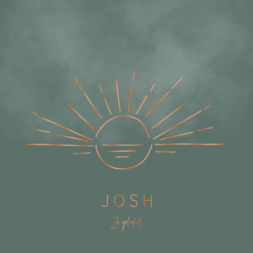 Dit geboortekaartje voor een jongen met opkomende zon in koperfolie kun je zelf aanpassen naar een andere folie kleur. Ook de achtergrond kleur die nu groen is kun je je aanpassen en het lettertype. Zo versturen jullie straks eigen en unieke geboortekaartjes.