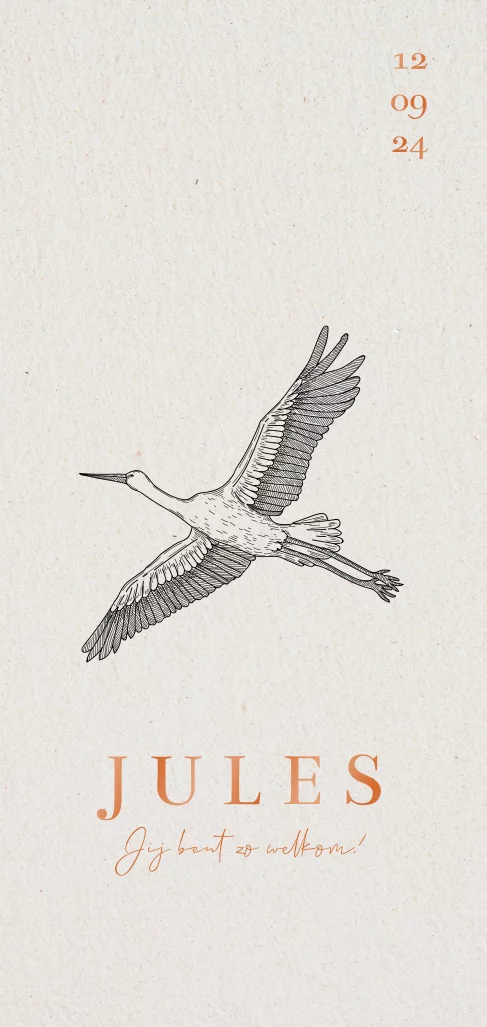 Dit geboortekaartje voor een meisje of jongen met getekende schets van een ooievaar kun je zelf aanpassen naar wens.