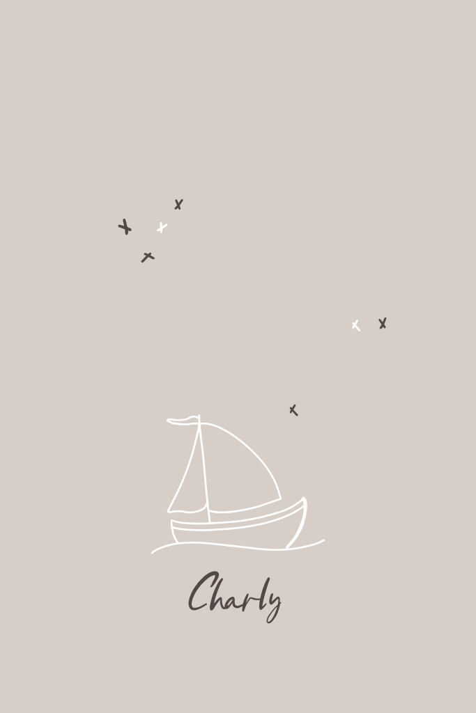 Geboortekaartje met lijntekening van zeilboortje in goudfolie en sterren. De kleuren en het lettertype kun je allemaal aanpassen naar wens. Charly