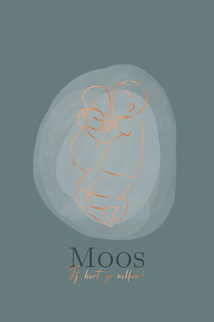 Een lief geboortekaartje met een lijntekening van een peuterbroer met blauwe en beige tinten en de lijntekening en tekst in de foliedruk koper kleur.