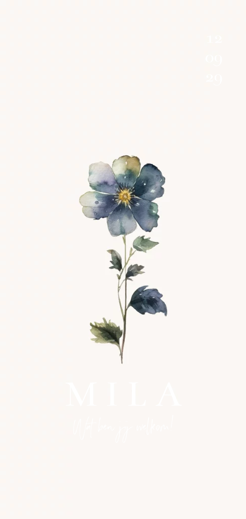 Een lief geboortekaartje voor een meisje met blauw viooltje en tekst in zilverfolie kleur. Dit kun je allemaal aanpassen naar wens en smaak. Mila