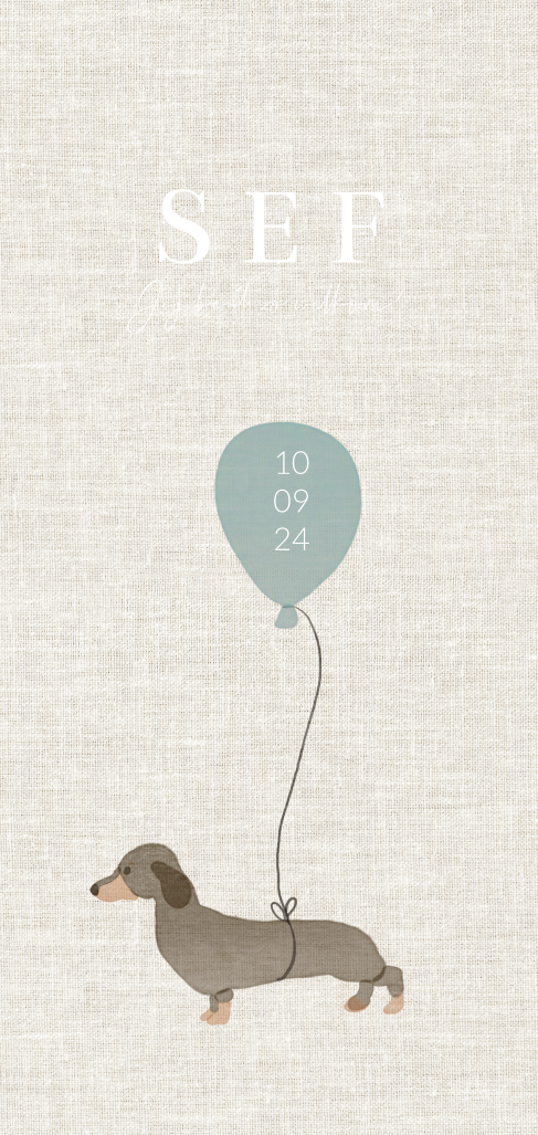 Geboortekaartje met teckel hondje en ballon tekst in goudfolie