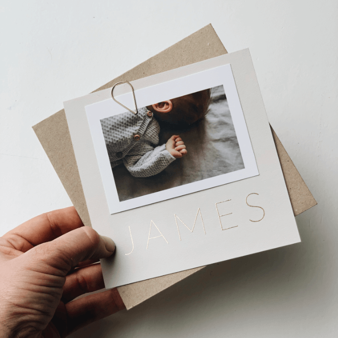 Minimalistisch unisex polaroid geboortekaartje met goudfolie