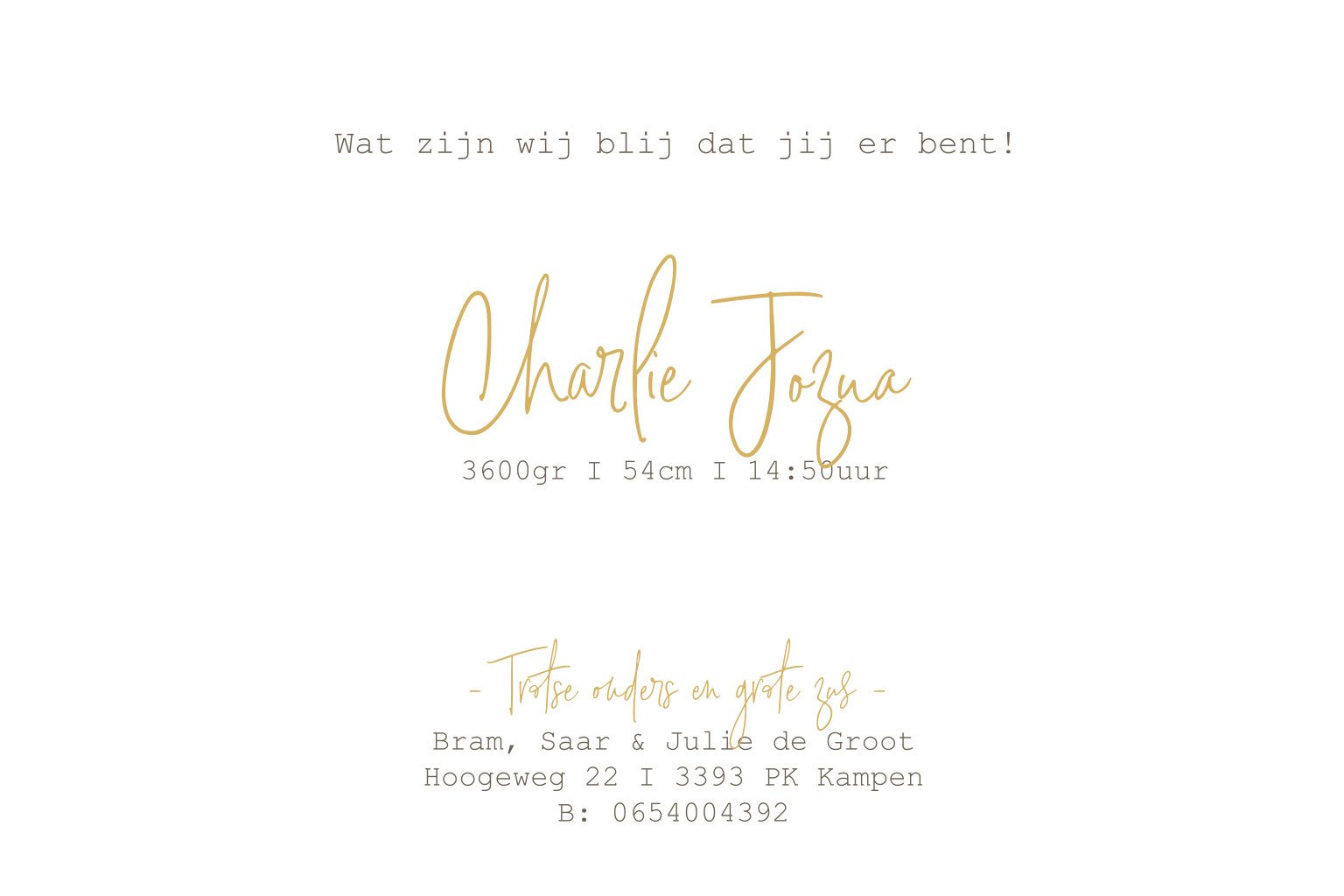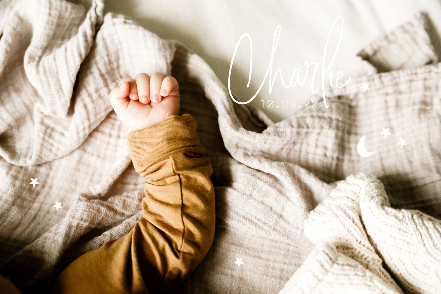 Dit lieve geboortekaartje kan voor zowel een jongen als een meisje met de goudfolie sterren en maan. En de tekst in goudfolie. Je kunt het aanpassen naar zilverfolie of koperfolie. En natuurlijk met een newbornfoto van jullie eigen kleintje.