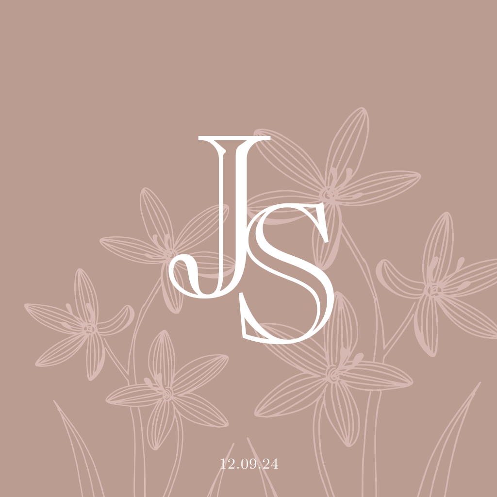 Een geboortekaartje met een roze achtergrond en initialen in goudfolie. Maar alles (de kleuren, het lettertype ed) kun je allemaal aanpassen naar wens. Net zoals de veldbloemen.