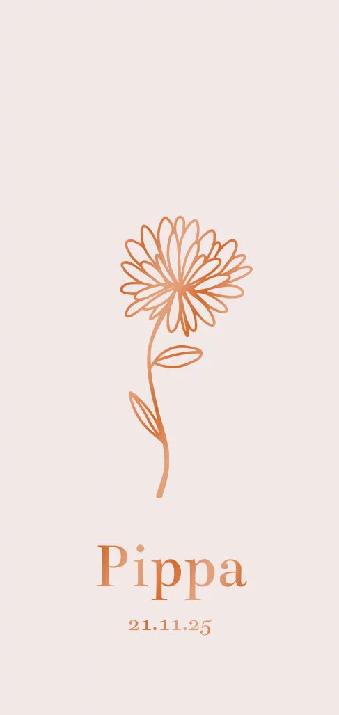 Geboortekaart met geboortebloem chrysant koperfolie roze