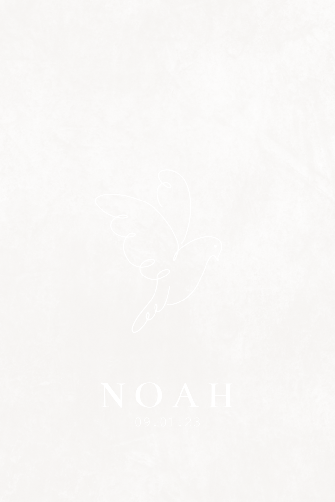 Een lief minimalistisch geboortekaartje voor een jongen of meisje met een lijntekening van een duif in foliedruk. De kleuren en het lettertype kun je aanpassen naar wens.