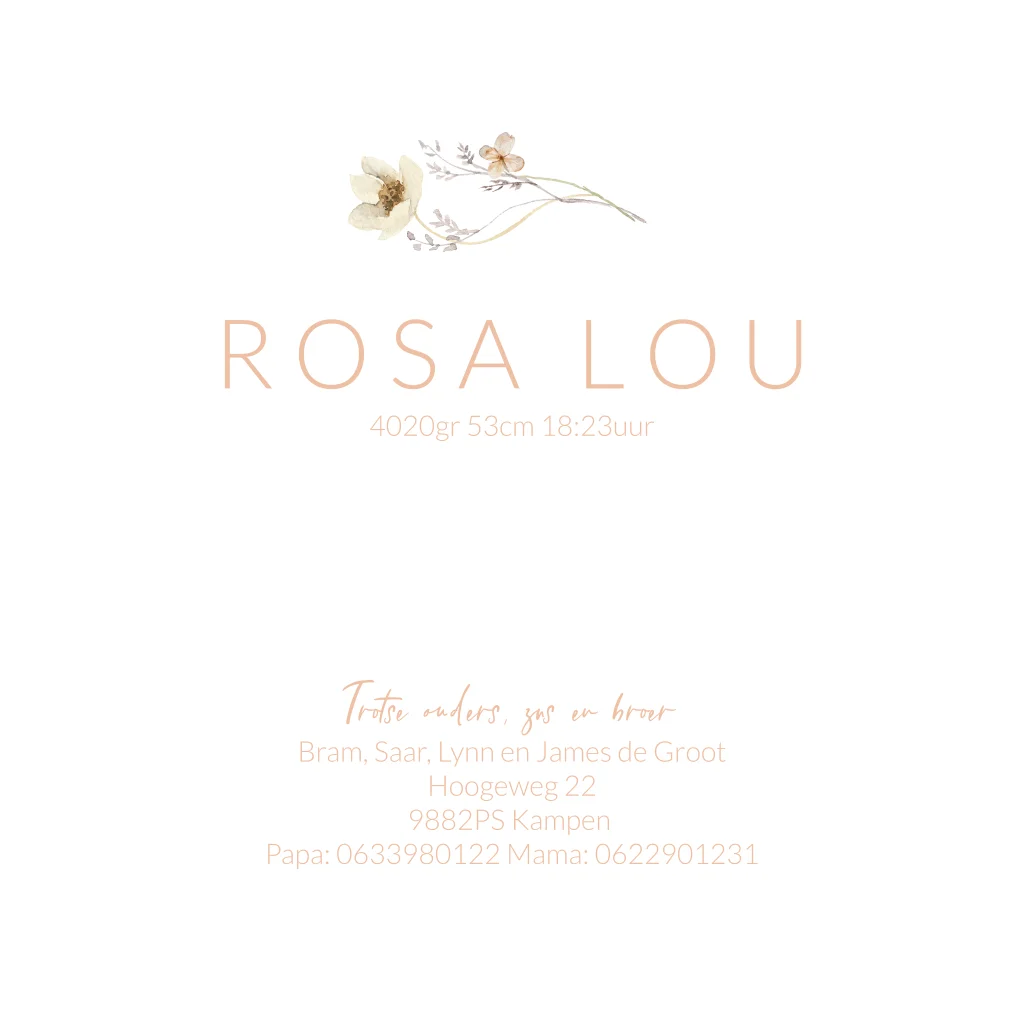 Geboortekaartje geschilderde bloemen roze rose folie dubbel